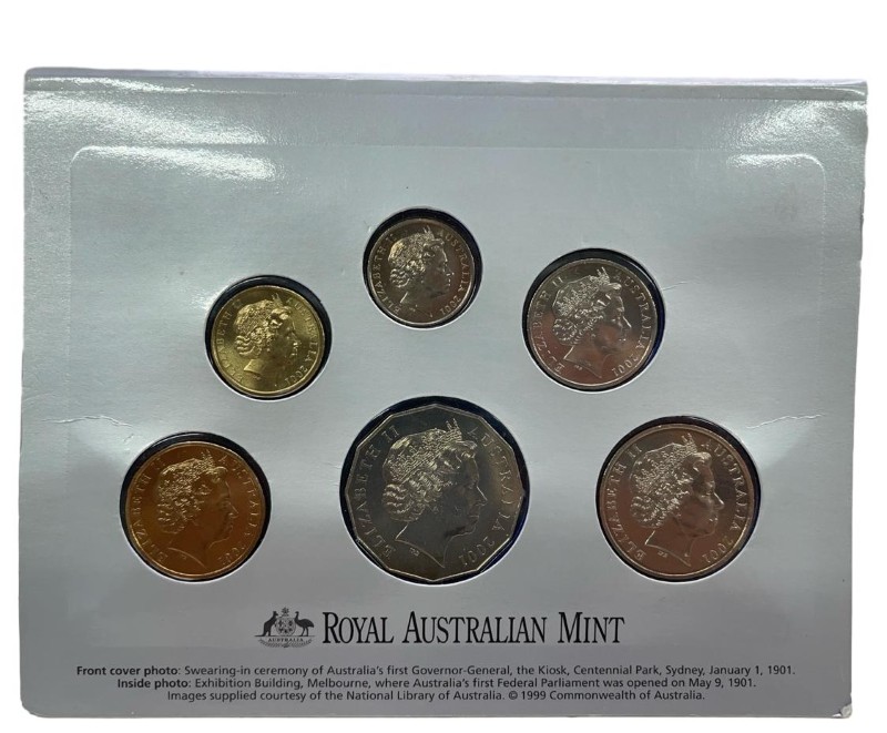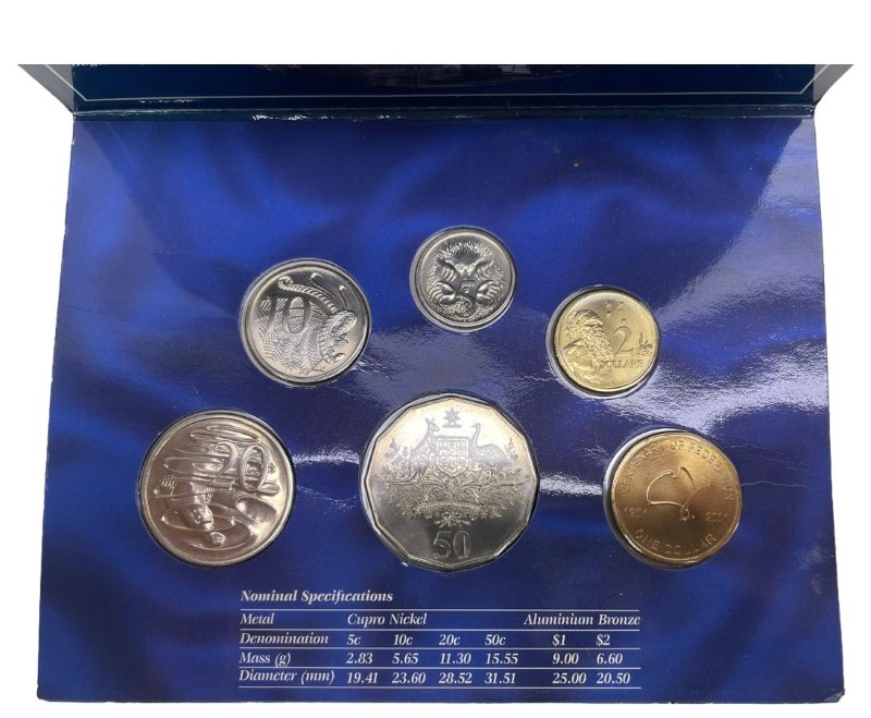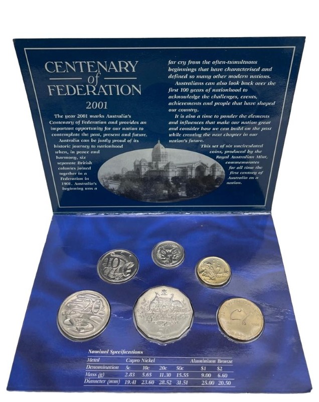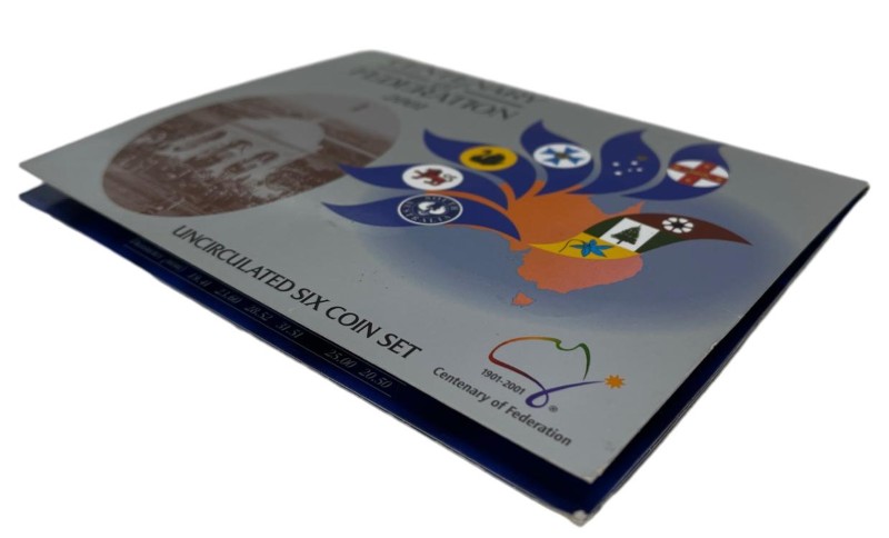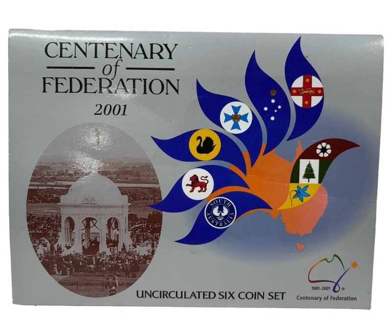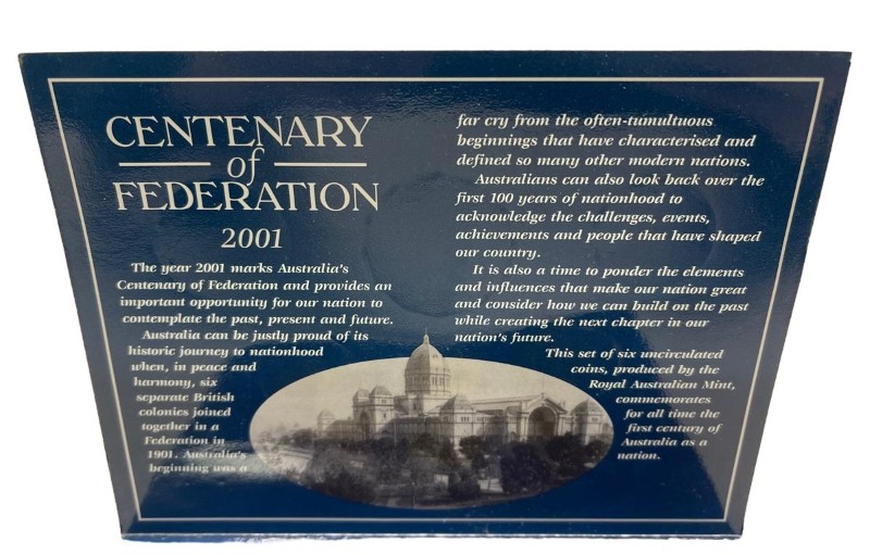 This impressive Centenary of Federation UNCIRCULATED SIX COIN SET from the Royal Australian Mint is a must-have for any serious collector. Minted in 2001, this set celebrates a significant milestone in Australian history with a stunning array of coins. Featuring a range of denominations, these coins are in good condition with little sign of wear, making them a valuable addition to any collection.