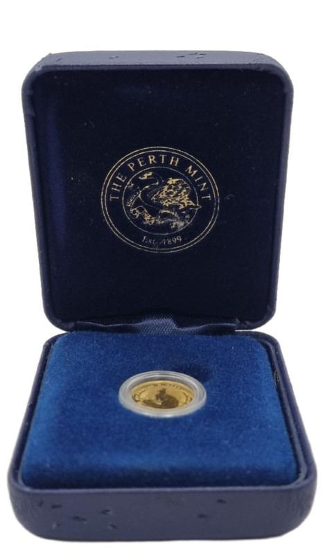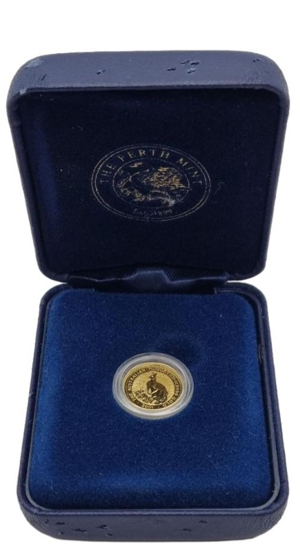 This 2001 The Australian Nugget 1/20oz 9999 gold coin from the Perth Mint is a sought-after collectible. Crafted from pure 24-karat gold, this diminutive coin features the iconic kangaroo design that has become synonymous with Australian gold coinage. The coin comes presented in its original case, though the case shows some wear and tear as evident in the provided photos. This is an excellent opportunity to add a premium gold coin to your collection.