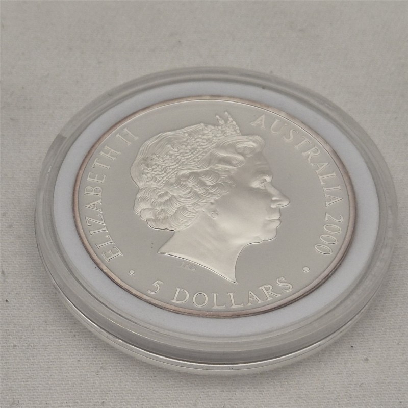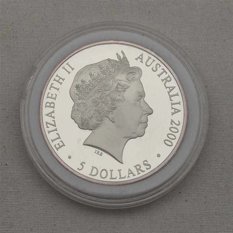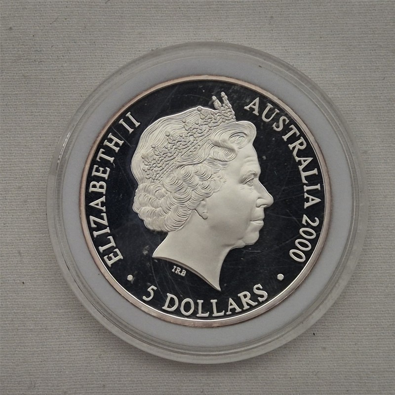 This 2000 SYDNEY $5 silver coin is a sought-after collectible from the Sydney Olympics. The intricate design features iconic Australian imagery, including the Sydney Opera House and a kangaroo. This piece would make a wonderful addition to any numismatic collection.