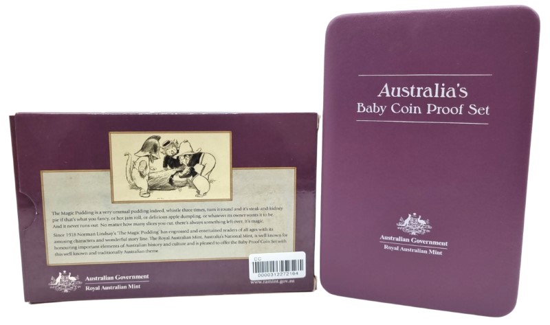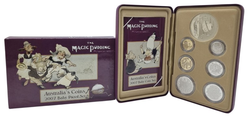 This 2007 Royal Australian Mint "The Magic Pudding" Baby Proof Set is a must-have for any collector of Australian coins and memorabilia. Featuring a range of high-quality proof coins, this set captures the whimsical charm of the beloved children's book. With little sign of wear, the coins are in good condition, making this an excellent addition to any numismatic collection.