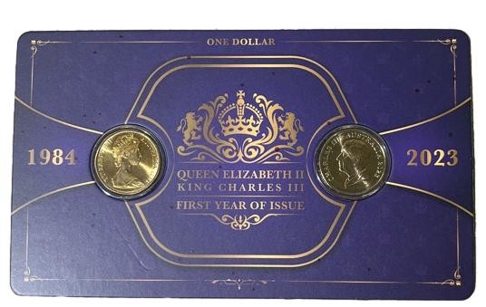 This coin pair features the first Australian dollar coins featuring the portraits of Queen Elizabeth II and King Charles III. The 1984 Elizabeth II coin and the 2023 Charles III coin are both in uncirculated condition, showcasing the classic Australian aluminium-bronze design. A unique collectible set for numismatists and history enthusiasts.