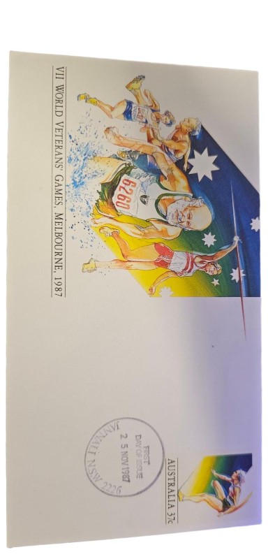 This vintage stamp album commemorates the VII World Veterans Games held in Melbourne, Australia in 1987. It features the official event logo and was issued on 25 November 1987 in Jannali, New South Wales. This well-used album is in working condition, reflecting its history as a cherished collector's item.