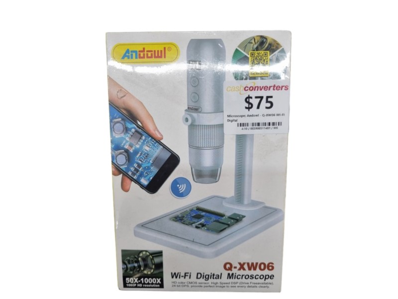 This Andowl Q-XW06 WI-FI Digital microscope is a versatile tool for hobbyists and enthusiasts. It features a digital display that allows you to view and capture detailed images of small objects. The microscope is in working condition, having been well-used.