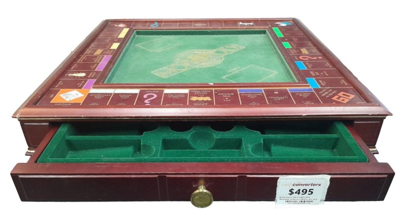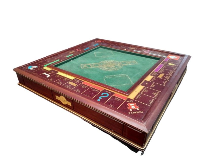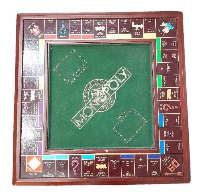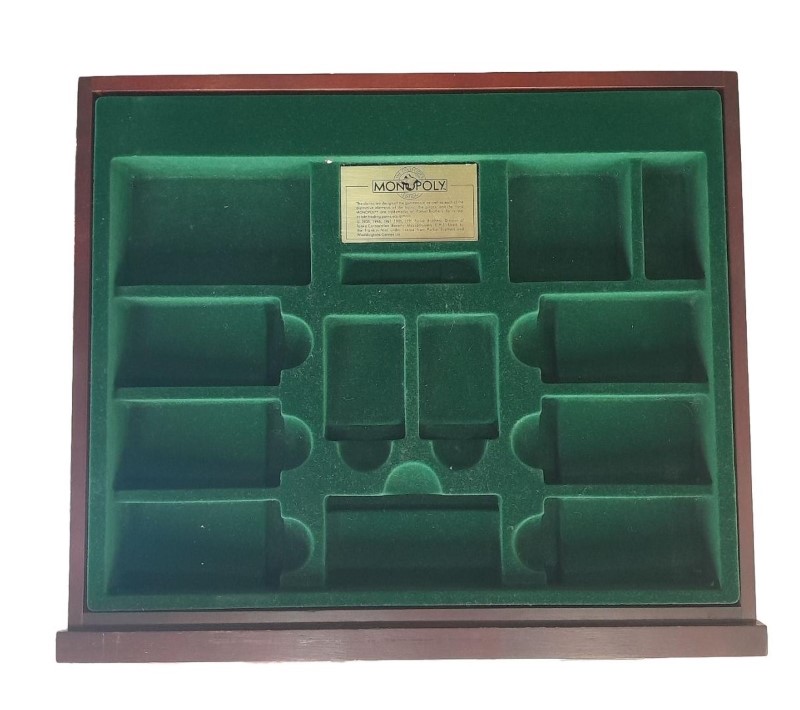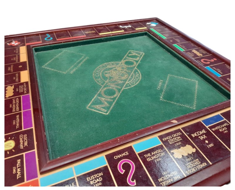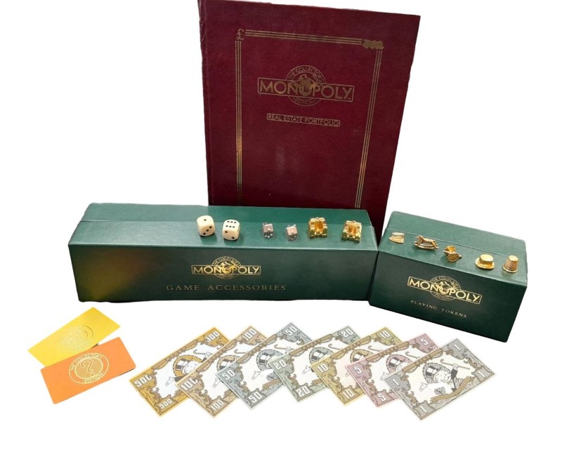 Please note: This Collectors Edition comes with 5x Gold Player pieces, With its own storage box. 2x Dice, 12x Gold Hotels, 32x Silver houses, Collectors edition currency, All in an accessories storage box, Community & Chance cards (please note box has some slight damage to corners) Real estate portfolio for property card storage. There is also storage under the board frame itself.