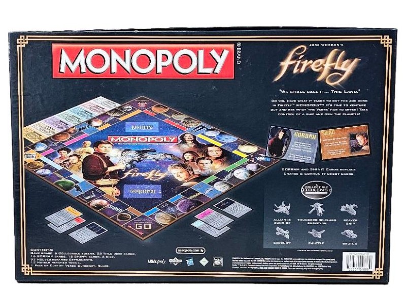 This classic Monopoly board game features the beloved characters and settings from the acclaimed sci-fi TV series Firefly. Fans of the show will delight in playing as their favourite Firefly crew members as they compete to buy, trade, and collect properties across the 'Verse. With its engaging gameplay and nostalgic theming, this Monopoly edition offers hours of strategic and thematic entertainment.