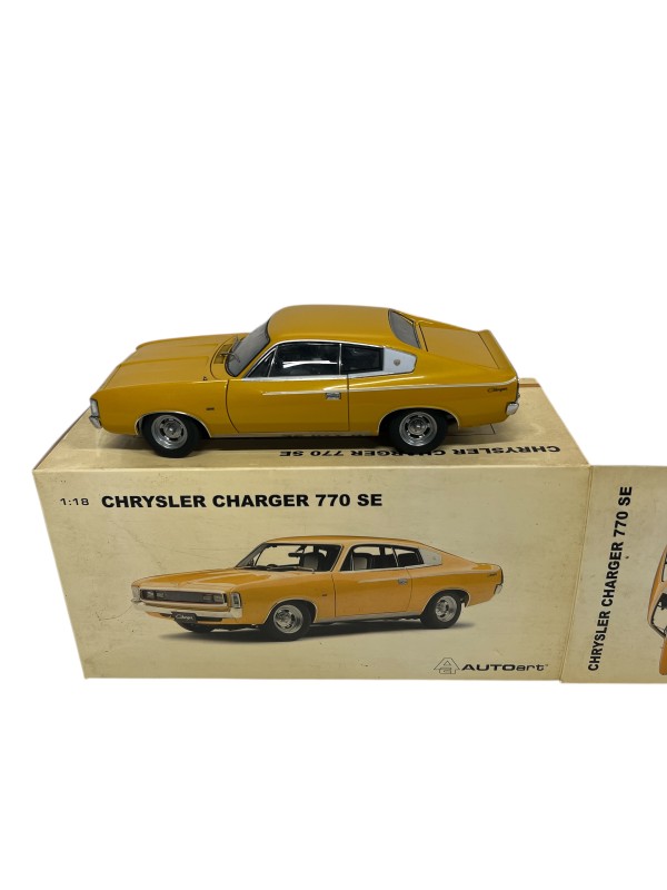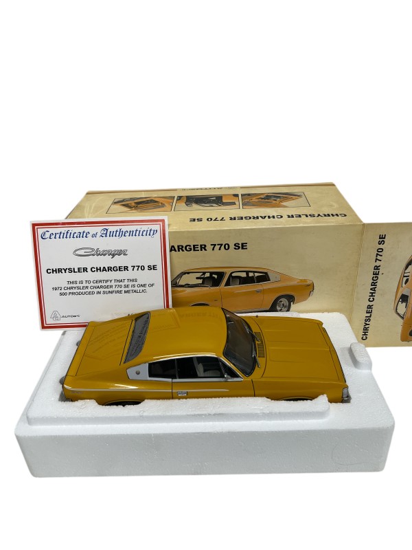 This AUTOART model car is a faithful recreation of the iconic Chrysler Charger 770 SE. With its sleek lines and powerful presence, this scale model captures the essence of the original vehicle. Crafted with attention to detail, it showcases the vehicle's distinctive design features and exudes an air of sophistication. Whether you're a collector or simply enjoy admiring automotive masterpieces, this model car is a must-have addition to your collection. Please note this item has been on display.