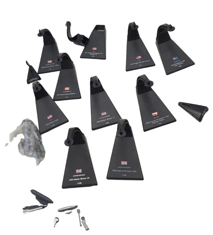 This assortment of model planes and stands is perfect for the aviation enthusiast. With a variety of different designs, these pre-owned models offer a diverse range of options to display and enjoy. Though they exhibit signs of heavy use, they remain fully functional, allowing you to appreciate the intricate details and engineering that went into their creation.