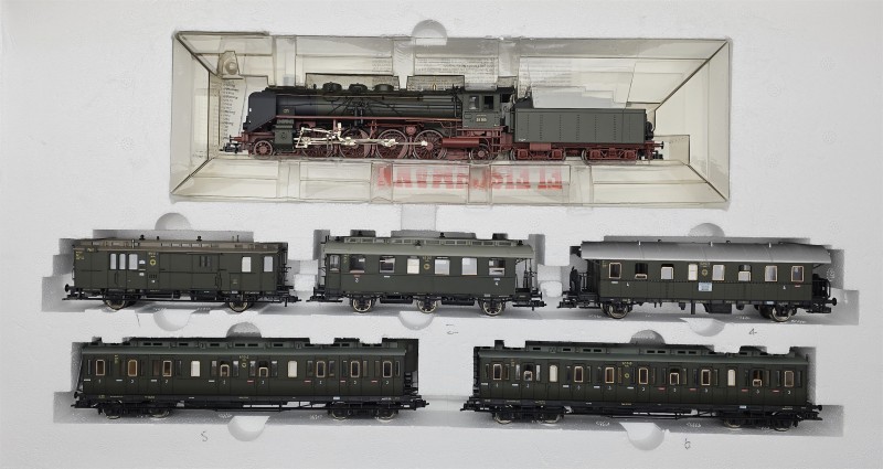 This set consisting of a 2-8-2 DR 39105 Locomotive and 8-wheeled Bogie Tender, green, a Post/Baggage Car with Clerestory roof, a 6-wheeled 3rd/4th Passenger Coach with Clerestory roof, an all 4th Passenger Coach with platforms to either end and 2 x Bogie Coaches with Clerestory roofs.