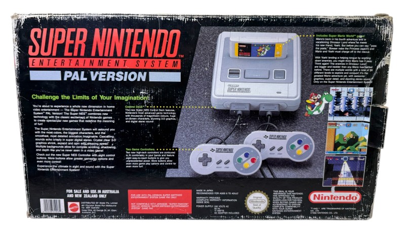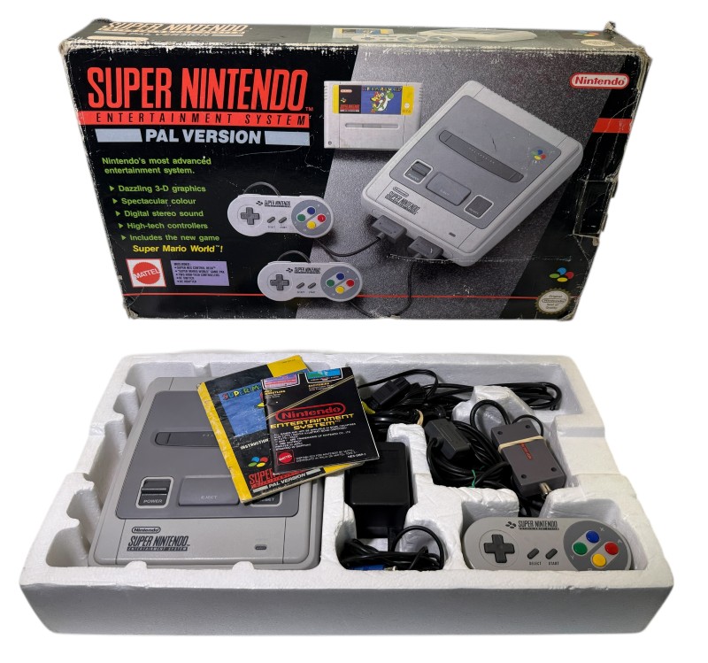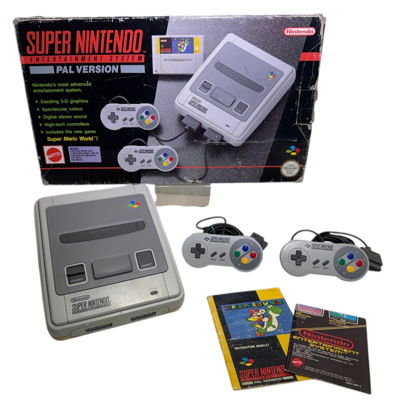 This classic Super Nintendo console comes with everything you need for hours of retro gaming fun. The console itself is in good condition, with only some light wear marks on the exterior. The included controllers are also in good shape, with minimal signs of use. The original box and foam insert are included, though the box does show some heavy wear and tear from years of storage. This complete Super Nintendo package is ready to be enjoyed by the next generation of gamers.