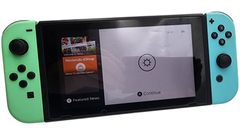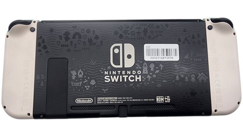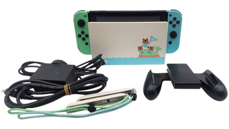 This Nintendo Switch console is the limited edition Animal Crossing: New Horizons edition, featuring a unique design inspired by the popular game. With 32GB of storage, it's ready to accommodate your digital library of games. The console comes with a full set of accessories, including the dock, Pro Grip, power supply, Joy-Cons, and a travel case, allowing you to enjoy the Nintendo Switch experience at home or on the go. While the console shows light cosmetic wear, it remains in great working condition.