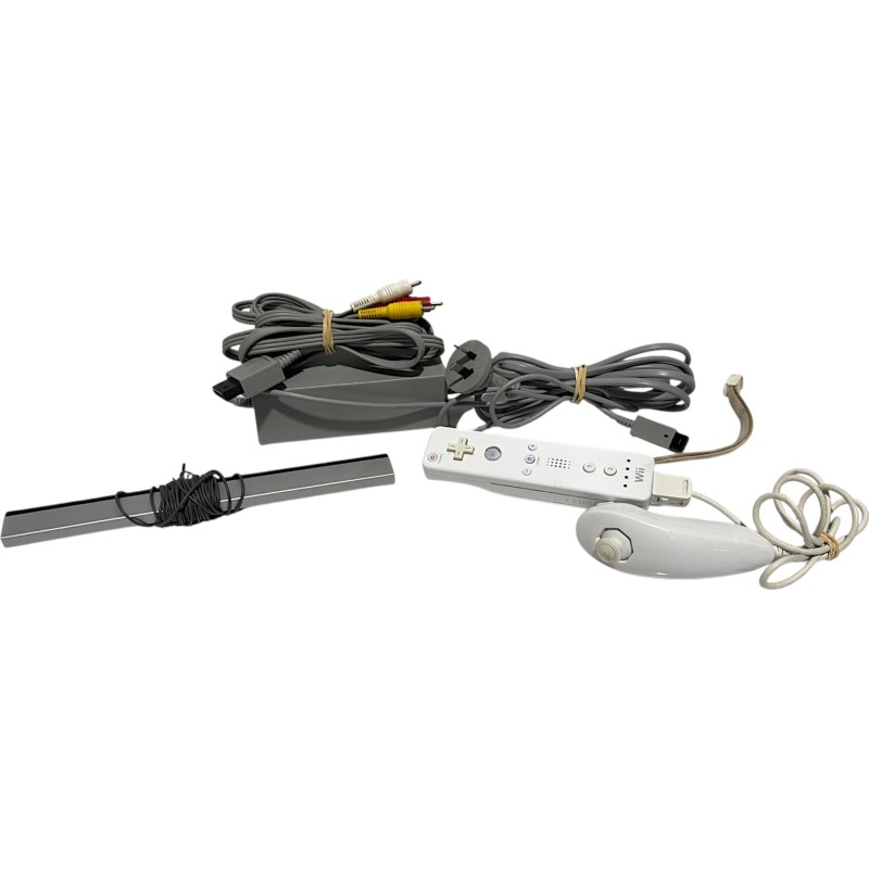 This Nintendo Wii gaming console is in good condition with little sign of wear. It features the RVL-001 model number and comes with a charging cord, HDMI cable, nunchuck, controller, and sensor camera.
