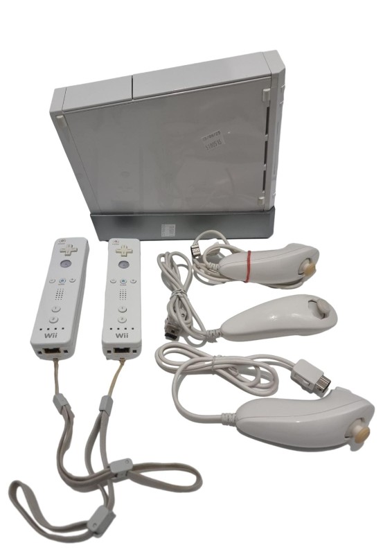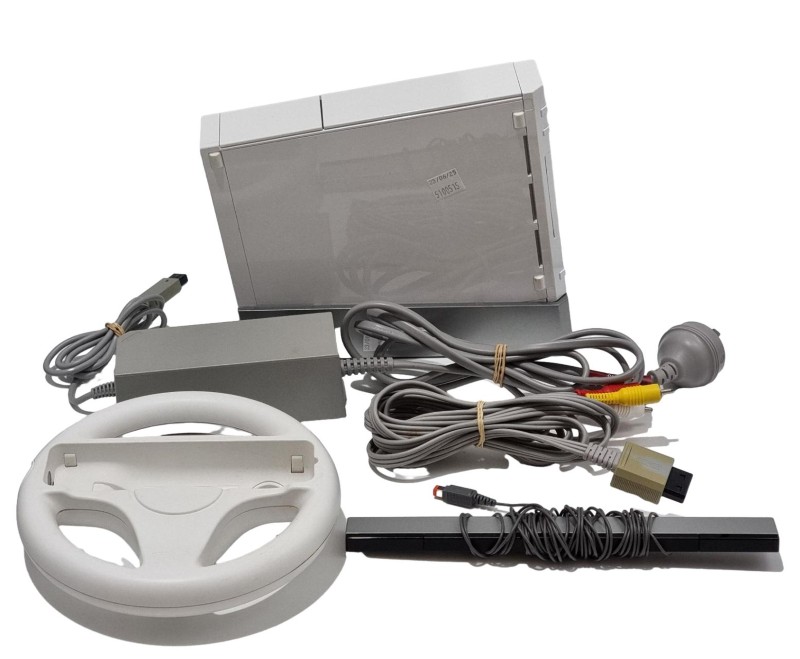 This Nintendo Wii console is a classic gaming system that offers a unique and immersive gaming experience. With its intuitive motion controls and a wide range of compatible games, the Wii provides endless hours of entertainment for players of all ages. The console features the RVL-001 model number and comes equipped with a variety of accessories, including 2x Wiimote with nunchucks, power, AV cable, sensor, and a wheel holder.