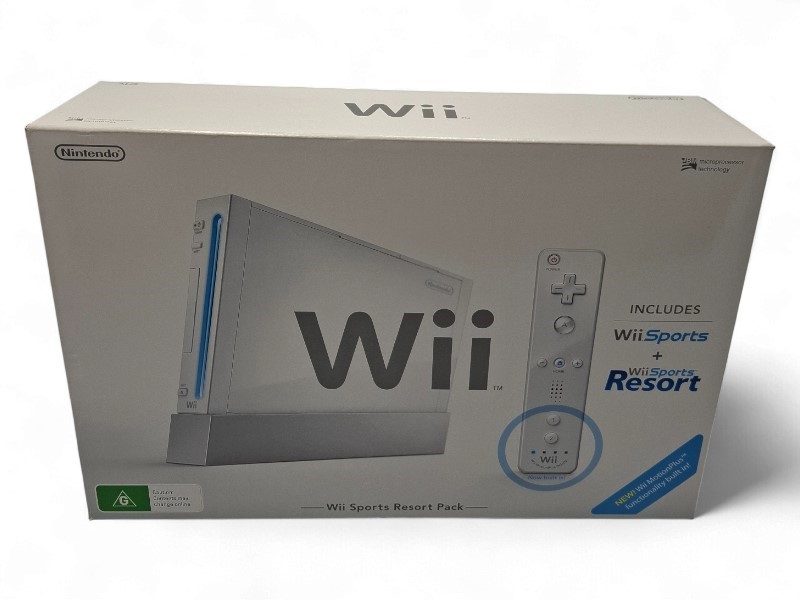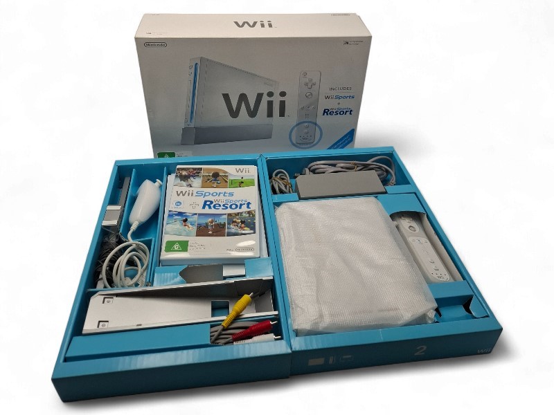 Accessories: In box with stand, power, RCA, nunchuks, Wiimote in boxes, booklets, WiiSports + Resort.