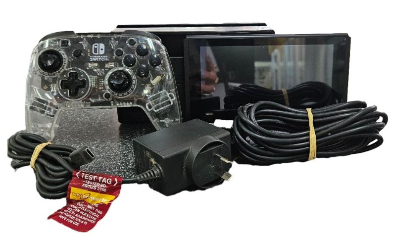 This Nintendo Switch console is a versatile gaming device that offers a seamless gaming experience. Despite not including the standard Joy-Con controllers, this console is still capable of delivering immersive gameplay. The console itself is in good condition, with minimal signs of wear, ensuring a reliable and enjoyable gaming session.
