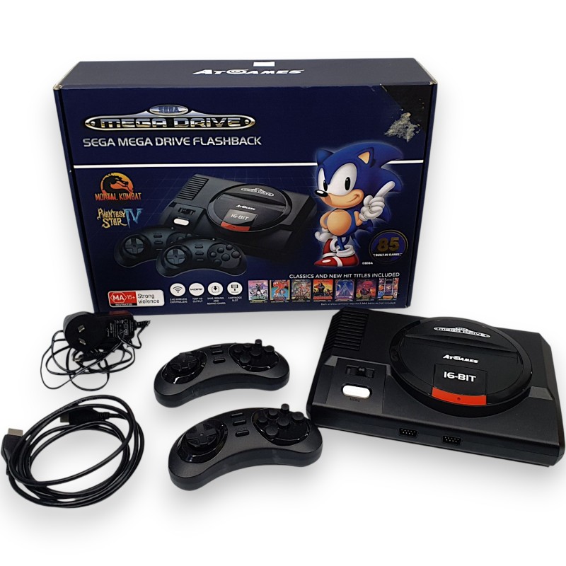This AtGames Sega Mega Drive Flashback captures the nostalgic charm of the classic gaming console. Featuring high-quality construction and modern HDMI connectivity, it's ready to deliver hours of retro gaming enjoyment. The console comes complete in the original box, accompanied by a power adapter, HDMI cable, and two controllers, allowing you to dive into beloved Sega titles with friends and family.