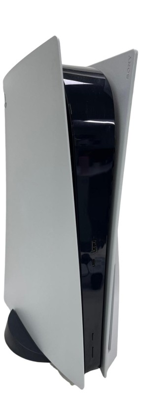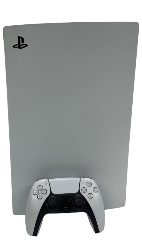 This Sony Playstation 5 console is in good condition with little sign of wear. It features a 1TB storage capacity and comes with the essential accessories including a power cable, HDMI cable, and a white DualSense controller.