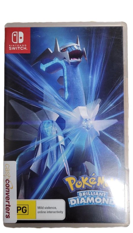 This Nintendo Switch game cartridge for Pokémon Brilliant Diamond is in good condition with little sign of wear. The game is rated PG and offers an engaging adventure in the Sinnoh region.