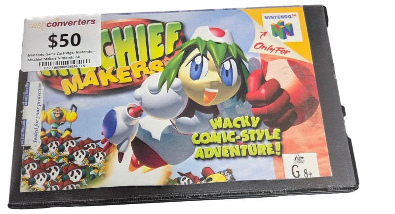 Enjoy the classic Nintendo 64 game Mischief Makers, a thrilling adventure that's sure to delight. This game cartridge offers an engaging gameplay experience, with vibrant graphics and a captivating storyline. While it may show some light cosmetic wear, the game functions as expected, providing hours of entertainment.
