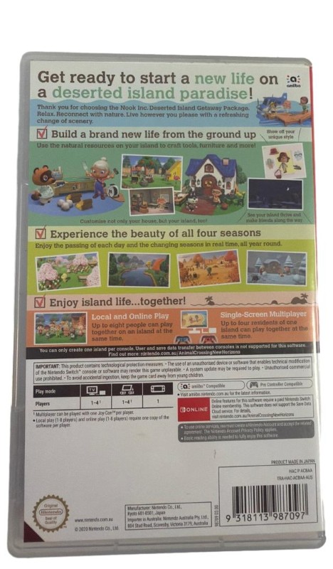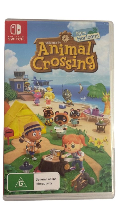 Immerse yourself in the charming world of Animal Crossing: New Horizons for the Nintendo Switch. This beloved life simulation game invites you to create your own unique island paradise, where you can customise your home, interact with delightful animal neighbours, and enjoy a peaceful, relaxing experience. With a G rating, this title is suitable for all ages to enjoy. The game cartridge is in good condition, with little sign of wear.