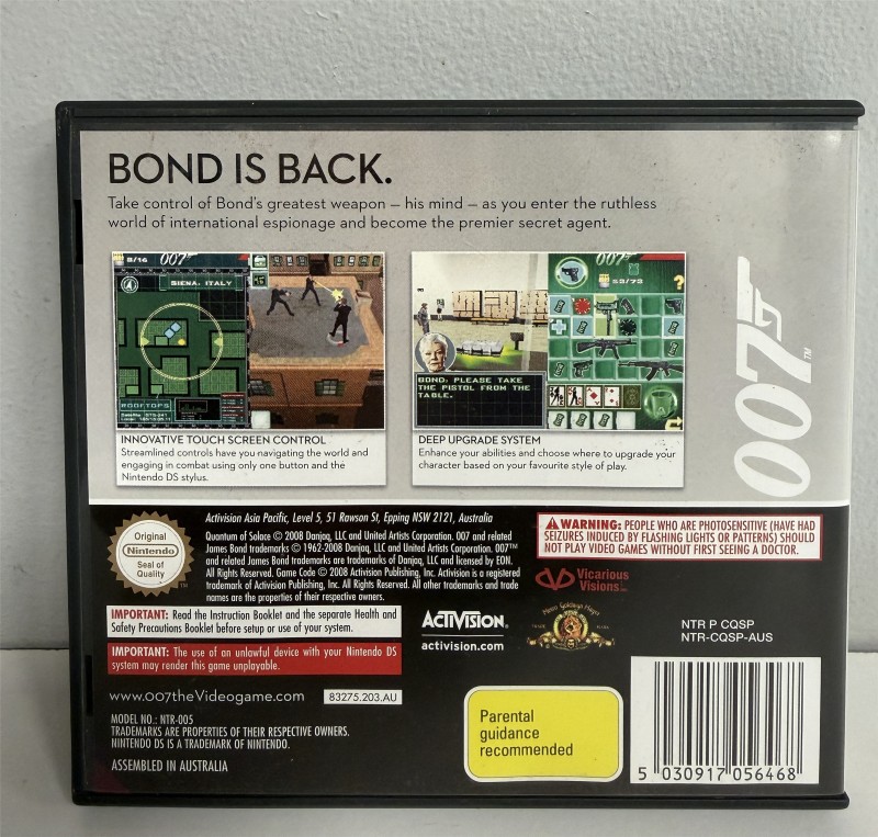 This classic Nintendo DS game cartridge allows you to step into the shoes of the iconic secret agent, 007. Featuring thrilling gameplay and stunning visuals, this G-rated title delivers an immersive gaming experience for all ages.