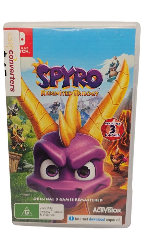 This classic Nintendo Switch game cartridge contains the Spyro Reignited Trilogy, featuring the beloved purple dragon in all his remastered glory. Relive the nostalgia of the original Spyro the Dragon, Spyro 2: Ripto's Rage!, and Spyro: Year of the Dragon, now with updated visuals and enhanced gameplay. Explore vibrant realms, defeat fearsome foes, and uncover hidden treasures in this iconic platforming adventure. Suitable for all ages, this well-loved title is a must-have for any Nintendo Switch collection.