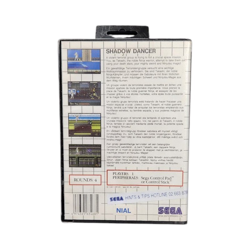 This classic Sega Master System game, Shadow Dancer: The Secret of Shinobi, offers an engaging ninja-themed adventure. Immerse yourself in the thrilling world of the Shadow Dancer as you navigate through challenging levels, face formidable foes, and uncover the secrets of the Shinobi. With its captivating storyline and satisfying gameplay, this cartridge is sure to provide hours of entertainment for retro gaming enthusiasts.