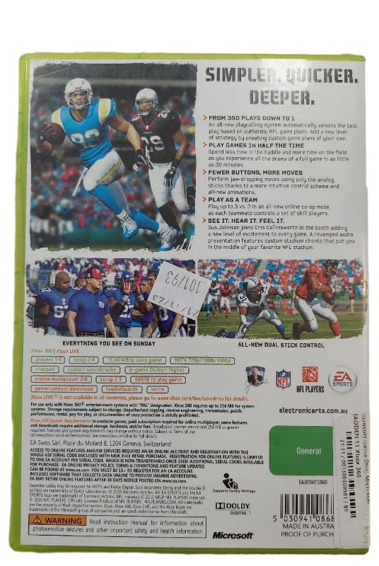 This pre-owned Microsoft Xbox 360 game disc offers an engaging football simulation experience with the latest edition of the acclaimed MADDEN 11 title. Featuring realistic gameplay, detailed player models, and immersive commentary, this game allows you to step onto the virtual gridiron and lead your favourite team to victory.