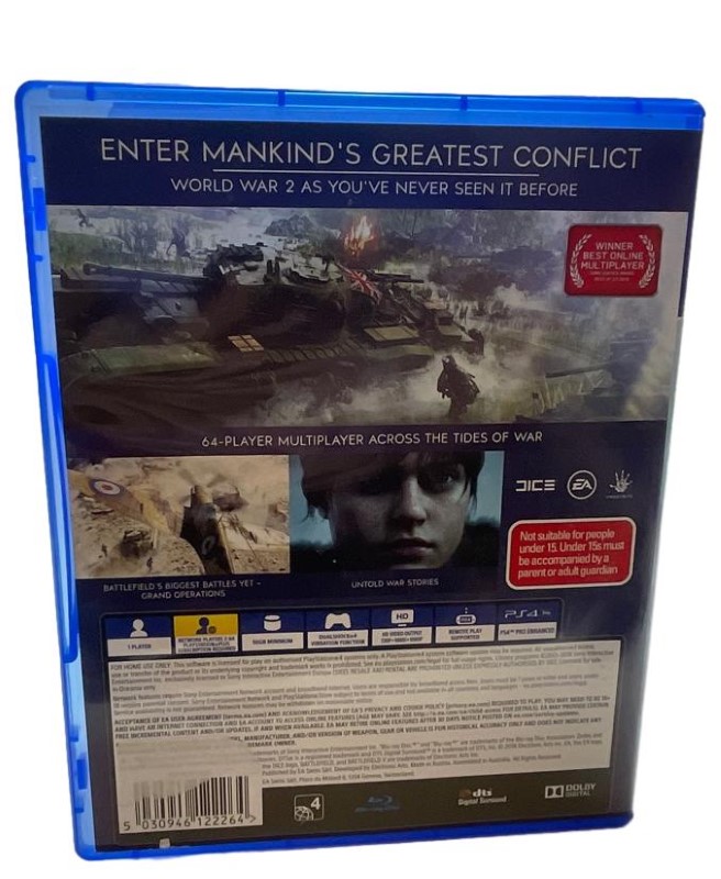 This Battlefield V game disc for the PlayStation 4 console offers intense first-person shooter action. Experience the epic scale of World War II battles with stunning visuals and immersive gameplay. Engage in thrilling multiplayer combat or dive into the captivating single-player campaign. Featuring stunning graphics, a deep progression system, and a wealth of content, this game is a must-have for fans of the Battlefield franchise.