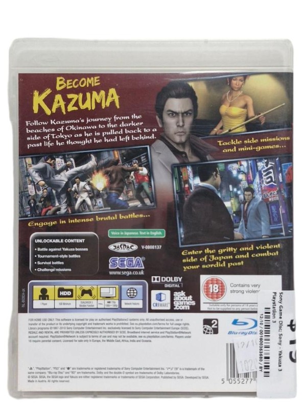 This PlayStation 3 game disc for Yakuza 3 is a thrilling action-adventure title that immerses players in the captivating world of the Yakuza crime syndicate. Featuring stunning visuals, a gripping narrative, and intense combat sequences, this MA15+ rated game promises an engaging and immersive gaming experience. With only a few light scratches, this secondhand disc is in good condition and ready to provide hours of entertainment.