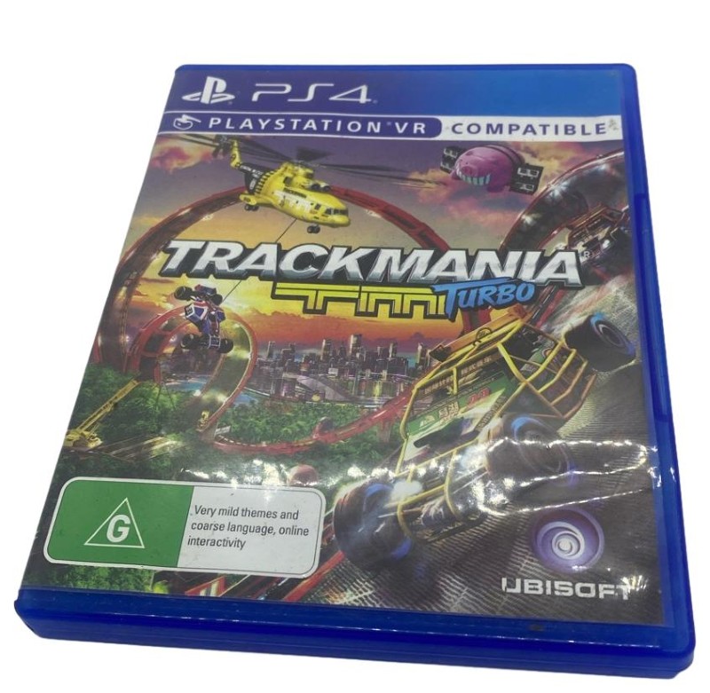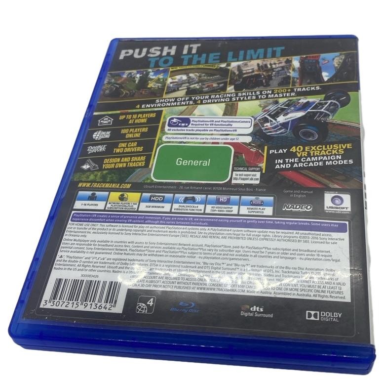This PlayStation 4 game disc for TRACKMANIA: TM TURBO offers an exciting racing experience. Developed by Sony, this title is rated G, making it suitable for all ages. While the disc shows some light scratches from previous use, it remains in playable condition.