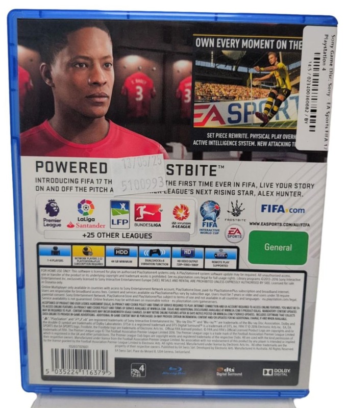 This pre-owned PlayStation 4 game disc contains the EA Sports FIFA 17 title. Featuring the latest edition of the popular football simulation series, this game allows you to experience the thrill of the world's most beloved sport. With realistic graphics, authentic team and player data, and a wealth of gameplay modes, this title is a must-have for any football enthusiast.