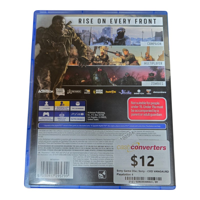This PlayStation 4 disc for COD VANGUARD offers an immersive first-person shooter experience. Developed by Sledgehammer Games and published by Activision, this game is rated M for mature audiences. With its gripping campaign, intense multiplayer modes, and thrilling Zombies mode, this title delivers a comprehensive Call of Duty experience.