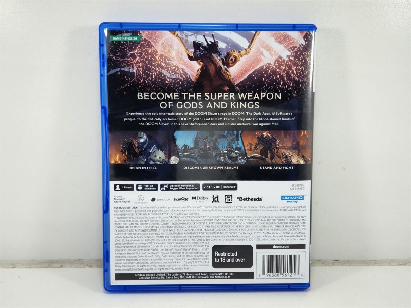 This Doom The Dark Ages game disc for the Playstation 5 console offers an immersive and thrilling gaming experience. Developed by the renowned Sony brand, this title immerses players in a dark and captivating world filled with intense action and suspense. With an R18+ rating, this game is suitable for mature audiences. While the disc shows a few light scratches, it remains in good condition and ready to provide hours of entertainment.