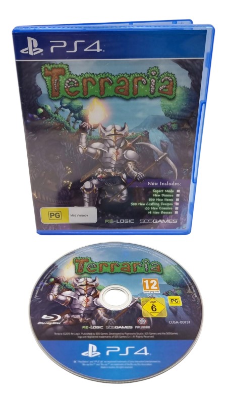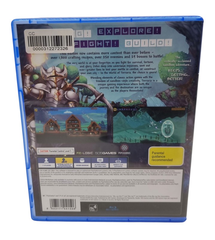 This is a secondhand PlayStation 4 game disc for the popular title Terraria. Terraria is a 2D sandbox game with a focus on exploration, crafting, and combat. Players can build, explore, and battle a variety of enemies in a randomly generated world. With a PG rating, this game is suitable for all ages.