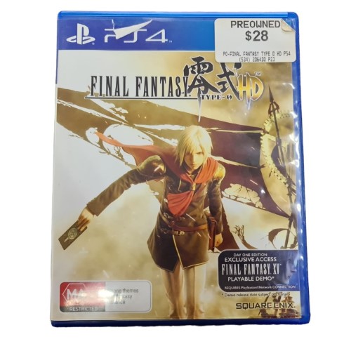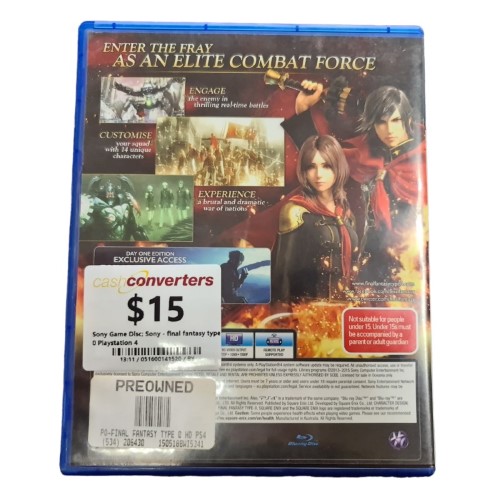 This PlayStation 4 game disc of the acclaimed title "Final Fantasy Type-0" offers an immersive role-playing experience. Featuring stunning visuals and an engaging narrative, this action-packed adventure is sure to captivate fans of the Final Fantasy franchise. With a mature rating of MA15+, this game is suitable for older players.