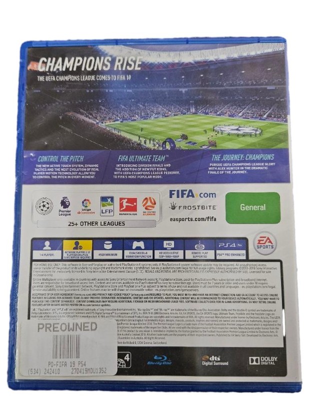 This PlayStation 4 game disc for FIFA 19 is in excellent condition, offering an immersive football experience. With its realistic gameplay, detailed player models, and comprehensive game modes, this title is sure to provide hours of engaging entertainment for fans of the sport. Whether you're looking to build your ultimate team, compete in tournaments, or simply enjoy a casual match, this game has something for players of all skill levels.