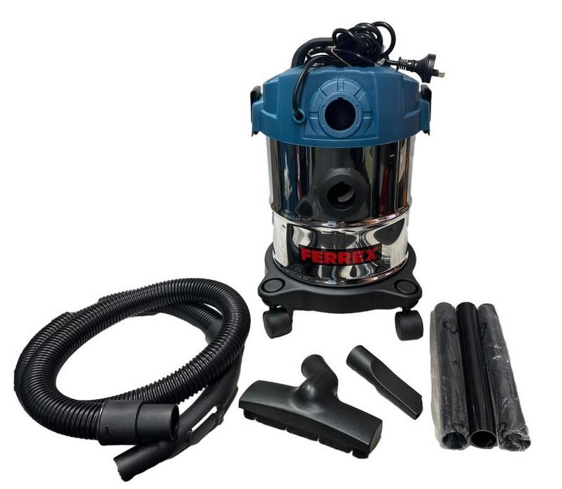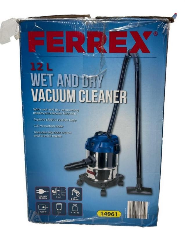 This high-performance Ferrex WDV12 Wet & Dry 12L Vacuum is a versatile cleaning solution for your home. With its powerful suction and large 12L capacity, it can handle both wet and dry messes with ease. The included accessories, such as the box, hose, spare head, manual, and wheels, ensure you have everything you need for a thorough clean.