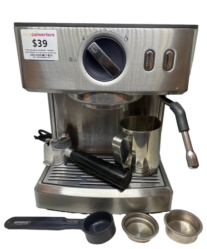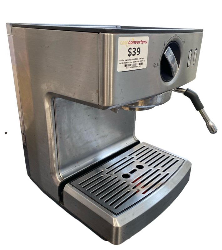 This SUNBEAM CAFE CREMA EM4820 coffee machine is a reliable and versatile addition to any kitchen. With its sleek design and intuitive controls, it delivers a delightful coffee experience. The included MILK CUP, COFFE GRIND HOLDER AND GRIND CUP provide convenient features for your daily coffee routine.