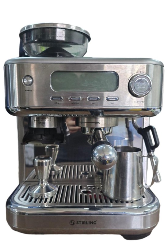 This STIRLING ESPRESSO MACHINE WITH GRINDER, model STR-E15BGD, is a versatile and reliable coffee maker that delivers a delightful café-style experience in the comfort of your own home. With its built-in grinder, you can enjoy freshly ground beans for a rich and aromatic espresso. The included milk jug, manuals, tamp, and filters ensure you have everything you need to craft your perfect cup of coffee. Despite some minor signs of wear, this machine remains in good condition and is ready to provide you with countless flavorful brews.