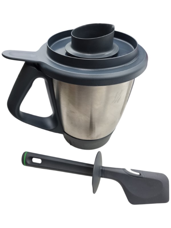 This Vorwerk Thermomix TM6-1 food processor is a versatile kitchen appliance that can handle a wide range of culinary tasks. With its powerful motor and precision controls, it can chop, blend, knead, and steam ingredients to perfection. The included bowl and spoon make it easy to prepare a variety of meals and recipes.