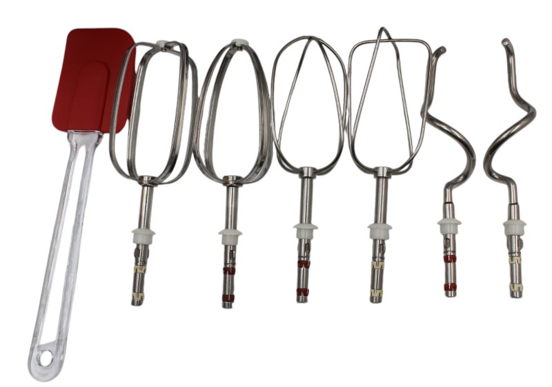 Accessories: Large Bowl, Small Bowl, Dough Hook Set, Beater Set X 2, Spatula