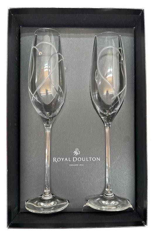 This elegant set of two Royal Doulton patterned champagne glasses is the perfect addition to any home bar or dining setting. Crafted with precision and attention to detail, these glasses feature a timeless design that will complement a variety of decor styles. The included box provides a convenient way to store and protect the glasses when not in use.
