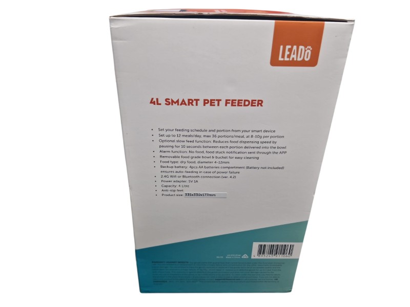 This smart pet feeder from Leado is perfect for keeping your furry friend's meals organised and on schedule. With a generous 4L capacity, it can hold ample amounts of dry food to ensure your pet is well-fed throughout the day. The automatic dispensing function allows you to program feeding times, so your pet can enjoy consistent meal times even when you're not at home. This feeder comes with a power supply, making it a convenient and reliable option for your pet's dietary needs.
