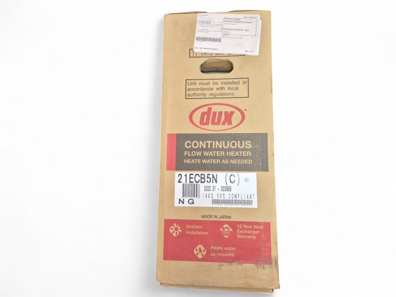 This high-quality DUX HOT WATER gas water heater offers reliable and efficient heating for your home. With a model number of 21ECB5N, it is a versatile and durable appliance that can meet your hot water needs. Featuring advanced technology, this water heater ensures consistent and dependable performance.