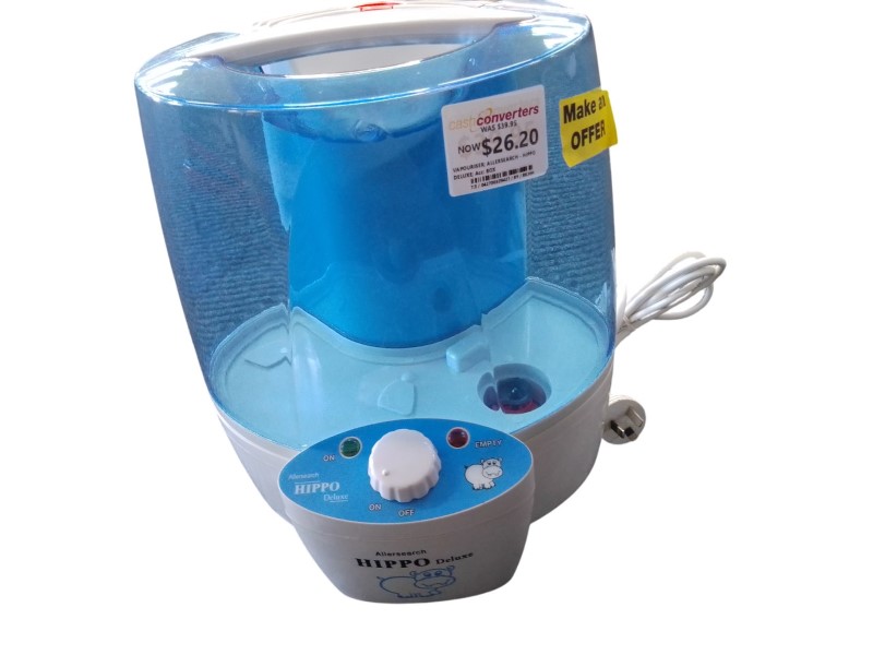 The Allersearch Hippo Deluxe Steam Vaporiser is a reliable table top humidifier designed to enhance indoor air quality. With a tank capacity of 3.8 litres and a 10-hour operation time, this vaporiser boasts a power of 260W and a voltage of 230V. The vaporiser features auto shut-off for added safety and convenience, making it ideal for creating a comfortable and healthy living environment. In a stylish blue colour, this like-new vaporiser is a must-have for any home.