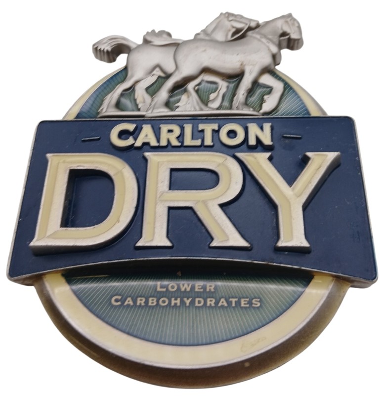 This Carlton Dry beer tap is a unique piece of memorabilia that can add a touch of character to any space. Its distinctive design and worn appearance reflect its history as a functional item that has been well-used over time. This one-of-a-kind ornament would make an eye-catching addition to a home bar, man cave, or industrial-style decor.