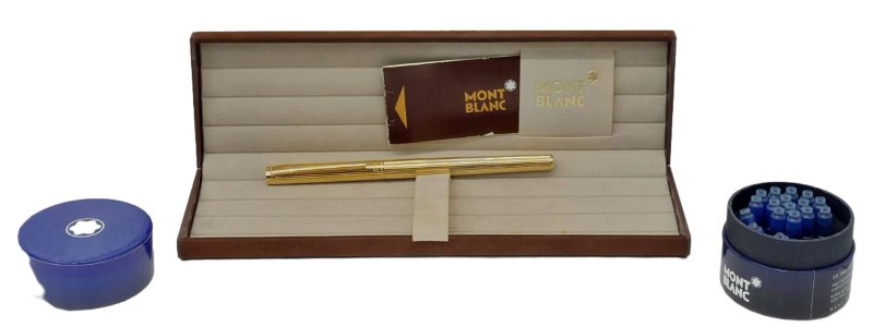 This Mont Blanc fountain pen features a premium 14K gold nib for a smooth, effortless writing experience. Designed for everyday use, it comes with a stylish case and extra ink cartridges to keep you writing for longer. The included booklet provides guidance on using and caring for your new pen.