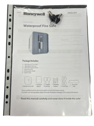 This Honeywell 2901 Waterproof Fire Safe is a reliable and secure storage solution for your important documents and valuables. Designed to withstand fires, it features a durable construction that keeps your belongings protected. With the included manual and key, you can easily access the contents as needed. Despite some minor signs of wear, this safe remains in good condition, ready to provide the peace of mind you need.