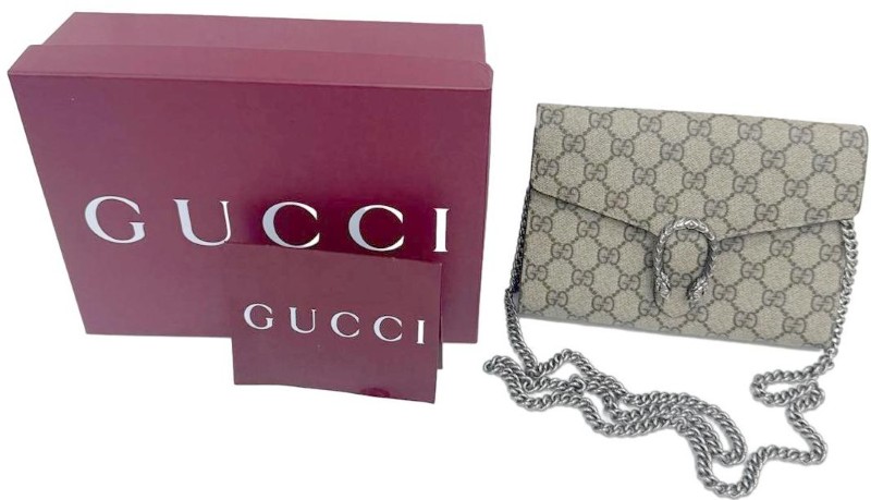 This chic Gucci GG Supreme Monogram Mini Dionysus Chain Wallet in beige is a versatile accessory that effortlessly blends style and functionality. Crafted from the brand's iconic GG Supreme canvas, this compact wallet features a chain strap for hands-free convenience. The Dionysus-inspired hardware adds a touch of signature Gucci elegance. This stylish piece is perfect for daily use or as a sophisticated evening companion.