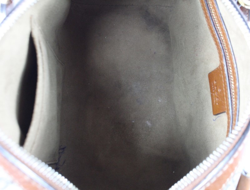 The bag is in good condition, presents well, zip in full working order, some markings to handle joins, light scratching to leather ends, minor existing fold bump to sized strap and pen+markings to the interior (see photos). Bag only.